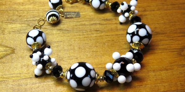 A classic color combination, black and white is one of my three best sellers, along with ivory/white and aquamarine--this transparent blue glass is soooo gorgeous!