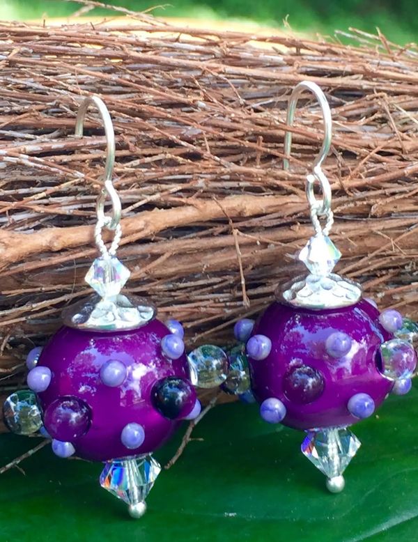 These purple-and-violet earrings started out much darker; after firing them in the kiln, they emerged a Wow-y, more "electric" hue.